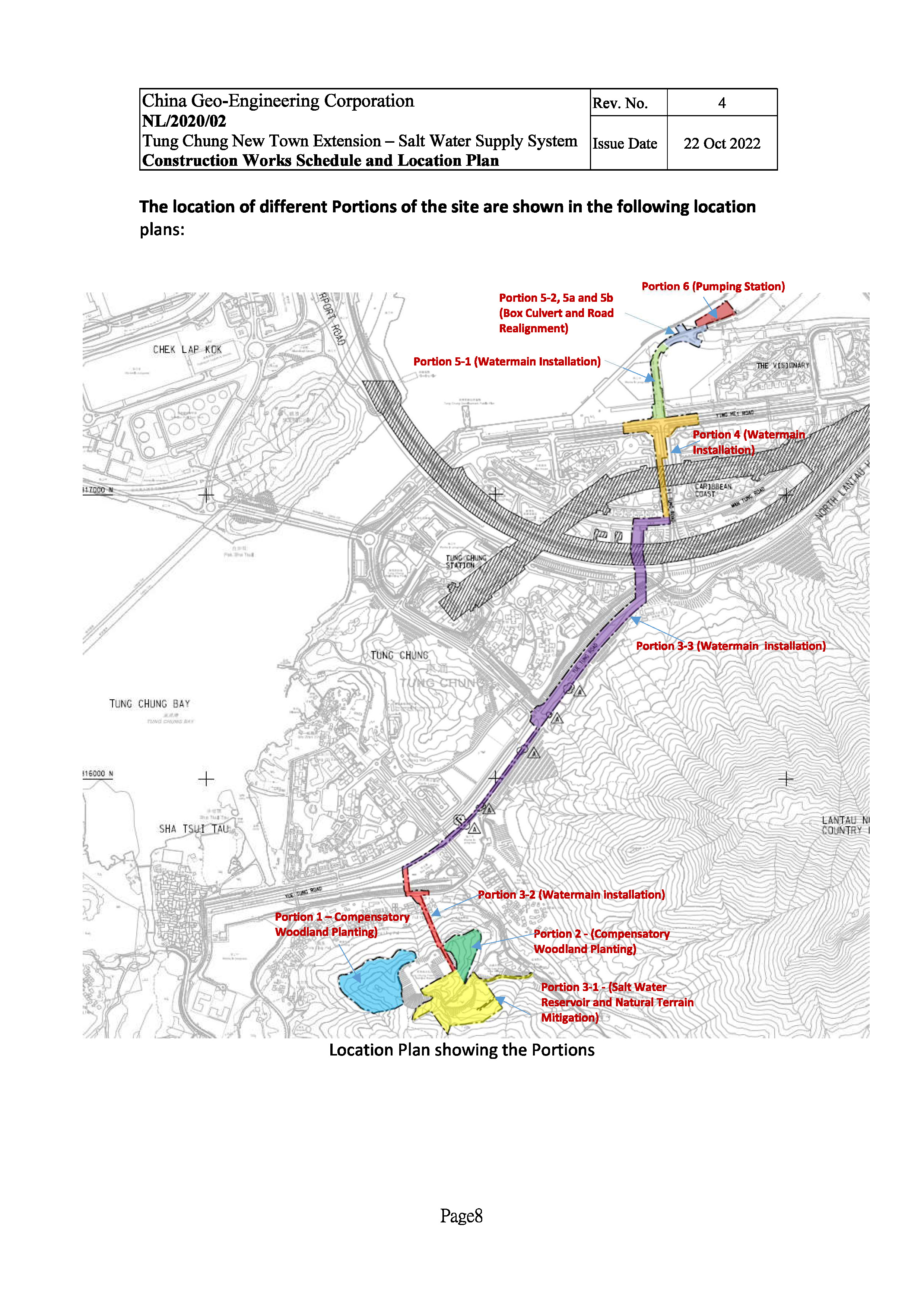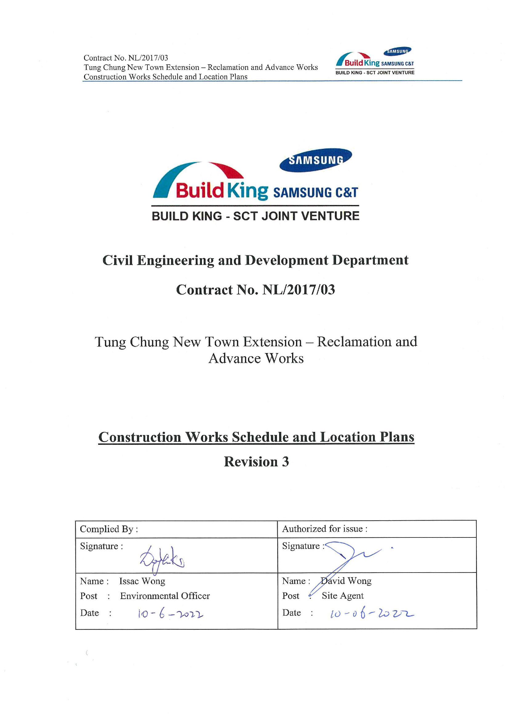 The Environmental Impact Assessment (EIA) Report (Register No.: AEIAR-196/2016) prepared for the “Tung Chung New Town Extension” (hereinafter referred to as “the Project”) has been approved by the Director of Environmental Protection, and an Environmental Permit (EP) (Permit No.: EP-519/2016) has been issued for the project under the Environmental Impact Assessment Ordinance.  This submission of Construction Works Schedule and Location Plans has been prepared in accordance with Condition 2.12 of the EP which stipulates