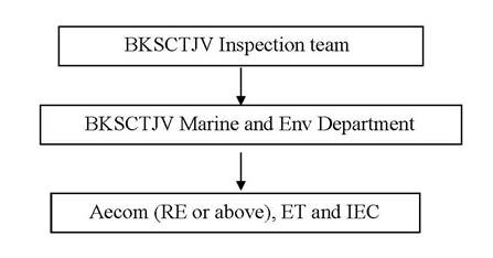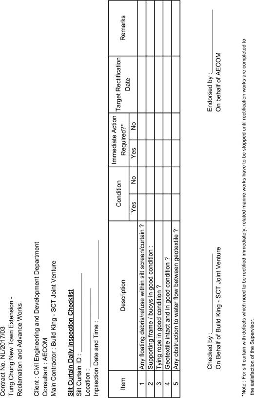 i)     On-board supervisors will be assigned to check the condition of the silt curtain before commencement of works every day. Completed inspection checklists will be kept on site for record purpose. Refer Appendix D for the sample of Silt Curtain Daily Inspection Checklist. Diver inspection will be arranged after adverse weather and when necessary.
