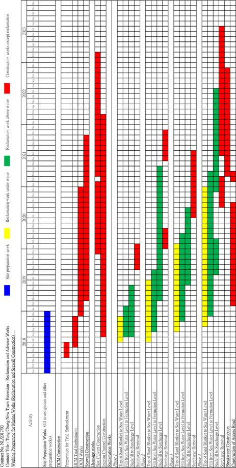 A brief programme showing the major reclamation works and their related works is enclosed in Appendix A. In general, perimeter silt curtain has to be deployed to enclose the works area as far as practicable. The minimum length of overlapping silt curtain and the width of gap between 1st and 2nd layer of silt curtain is 150m and 100m respectively. Where the marine works are not enclosed by perimeter  silt curtain, localized silt curtain around the marine works shall be deployed to enclose the works area before start of the marine works. Additional localized silt curtain (frame type silt curtain) will also be deployed when placing sand with fine content of >5% to 10% onto the seabed (see Appendix C1 and Appendix C2). Some indicative phases of silt curtain deployment are presented as follows: