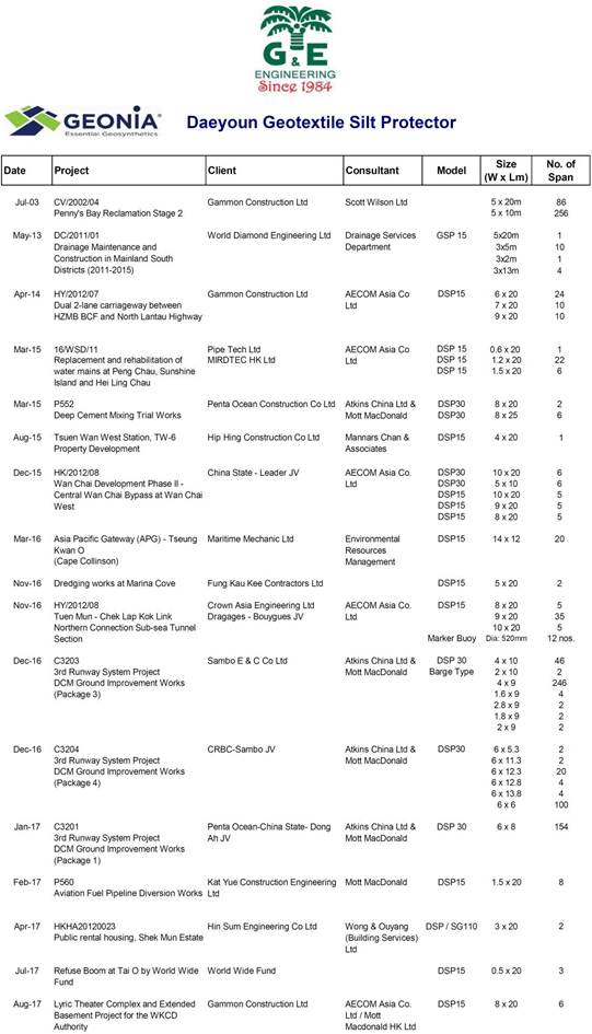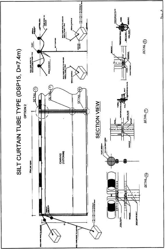 The floating single silt curtain consists of a layer of geotextile tied on 300-500mm diameter sub-buoys. The geotextile extended to the seabed level secured by steel chain ballast. The buoys will be further positioned by nylon ropes tied on nearby existing structures. Sufficient length of geotextile will be provided such that the silt curtain can be extended from the water surface to the seabed during high tide condition. The minimum overlapping length between the different sheet is 150m. Silt curtain (Model DSP15) with curtain depth of 7.4m (D=7.4m) and curtain strength 15 ton/m (Canvas (15ton/m)) is deployed in this project. Job reference and typical section of the proposed silt curtain is attached in Appendix B.