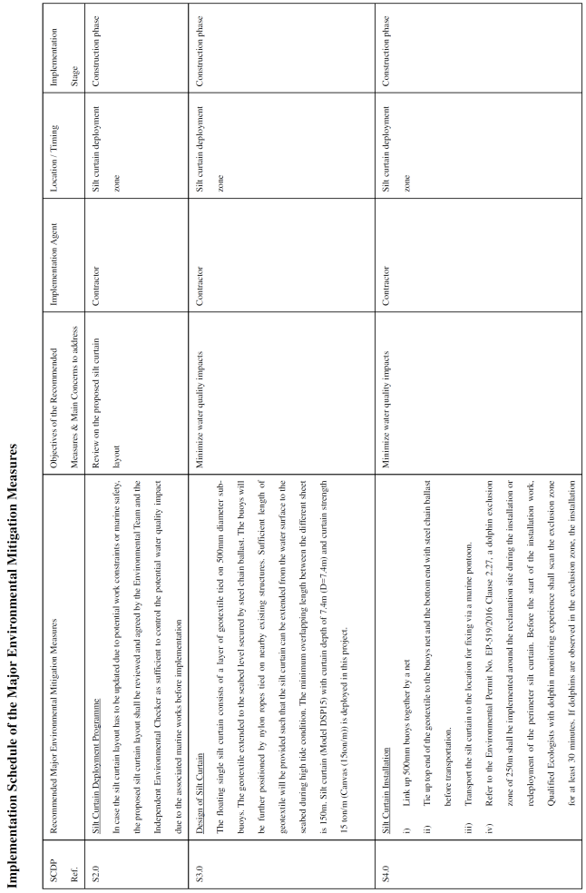 As the major works conducted near to the perimeter silt curtain are marine DCM works and sand placing works. All the DCM barges are under confinement by an additional primary and secondary silt curtain. Meanwhile, a frame-type silt curtain will be installed around the grab when placing sand onto the seabed. Therefore, with these protective measures, it is considered that sufficient protection to the marine quality is provided.