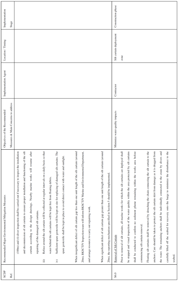 ii)    For the tentative arrangement of silt curtain under adverse weather (e.g. Red or Black Rainstorm, Typhoon Signal No. 3 or above etc.), the silt curtain will not be temporary removed during adverse weather. However, related works will be suspended immediately if silt curtain is found any damaged. Immediate inspection of silt curtain after adverse weather is necessary. Working procedures include (1) lift up the silt curtain for water by derrick barge, (2) sew (double-line sew) a new piece of geotextile to the existing geotextile to cover the damage area, (3) ensure sufficient overlapping length (150m) & width of gap (100m) and (4) diver inspection shall be carried out if necessary to inspect the installation and decommission of silt curtain to ensure proper installation and functioning of the silt curtain according to the design drawings. Nearby marine works will resume after repairing of the damaged silt curtains.