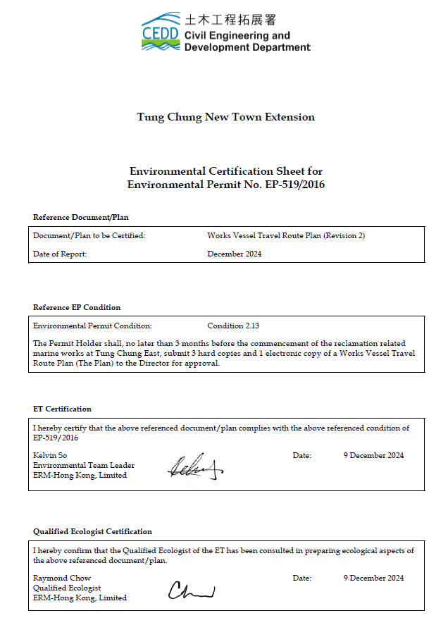 In accordance to EP-519/2016 Condition 2.13, this Works Vessel Travel Route Plan (WVTRP) shall be submitted to detail the planning, implementation, safety measures and monitoring of operational routings of the construction works vessels. The designated barging point located within the marina in Tung Chung will be used to transport construction & demolition (C&D) materials generated from the project via marine routes to the West Lagoon area or any other assigned destination as stated within the Plan. The key update for this version of Works Vessel Travel Route Plan is the transportation arrangement to the West Lagoon area after the completion of reclamation. Accordance with condition 2.5 of the EP, Qualified Ecologists had been appointed to form part of the ET and carry out work relating to ecological aspects. The Qualified Ecologists had been consulted in preparation of this Plan.