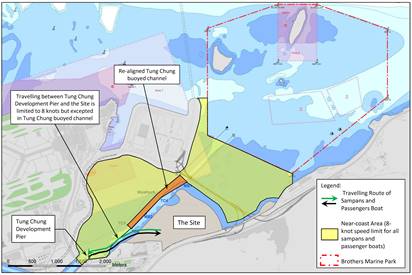 The Tung Chung Buoyed Channel falls into the Brothers Marine Park (BMP). Taking into consideration the restriction of BMP, the arrival and departure route will enter the site via the navigation corridor either between the Boundary Crossing Facility and west boundary of BMP.