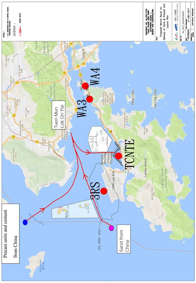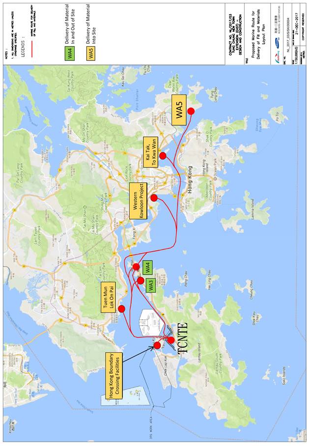 The marine travel routes for CEDD Contract No. NL/2017/03 delivery of sandfill, rockfill, sorted public fill, precast unit, cement and materials for DCM and NL/2020/03 exportation of construction & demolition materials are attached in Appendix C.