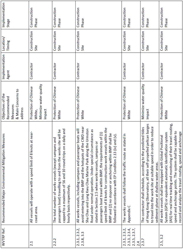 The potential impact of cumulative marine traffic disturbance or collision risk on dolphin due to large sized and slowly moving working vessels with relatively low traffic flow during towing are anticipated to be low. Nevertheless, speed limits and regular travel routes will be implemented to control and minimize marine traffic disturbance on dolphins. The supervising staff of the Contractor will record and control the trips to ensure not exceeding the daily and hourly trip basis. Moreover, good planning of construction vessel activities, minimize stationary/idle work vessels, reduction of waste materials will be implemented to minimize trips of the construction works vessels to and from the works site. Work vessels shall be scheduled tentatively at maximum 4 round trips for transportation of construction & demolition material at barging point on a daily basis. This is well within the maximum number of daily and hourly trips of the EP condition. The supervising staff of the Contractor will record and control the trips are well within the limit, in accordance to the EP Condition 2.13 of the environmental permit EP-519/2016, which specifies not exceeding 56 and 10 round trips on a daily and hourly basis respectively.
