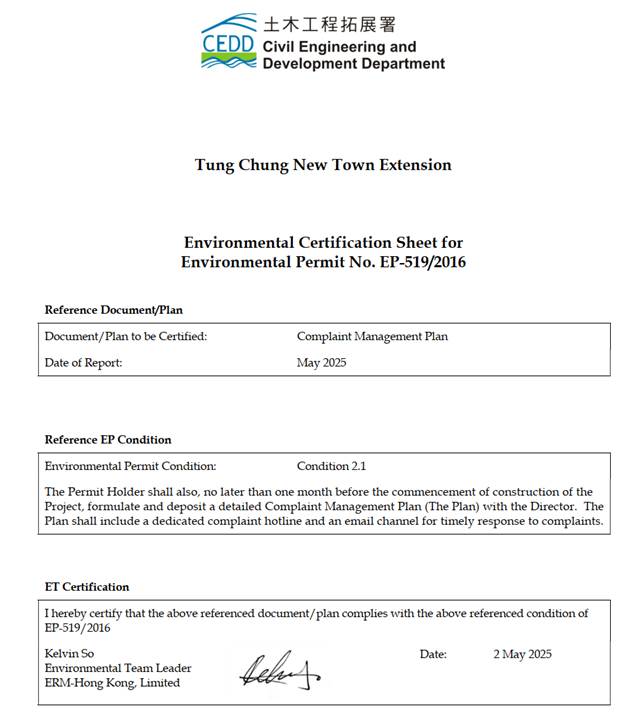 The Environmental Impact Assessment (EIA) Report (Register No.: AEIAR‑196/2016) prepared for the “Tung Chung New Town Extension” (hereinafter referred to as “the Project”) has been approved by the Director of Environmental Protection, and an Environmental Permit (EP) (Permit No.: EP‑519/2016) has been issued for the Project under the Environmental Impact Assessment Ordinance. This submission of Complaint Management Plan (CMP) has been prepared in accordance with Condition 2.1 of the EP to include a dedicated complaint hotline and an email channel for timely response to complaints. The complaint handling procedure will be discussed in detail in following sessions to ensure timely investigation and response to environmental complaints.