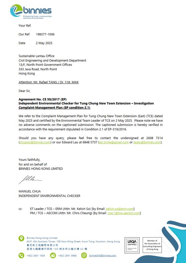 Complaint Management Plan for Tung Chung New Town Extension (East)