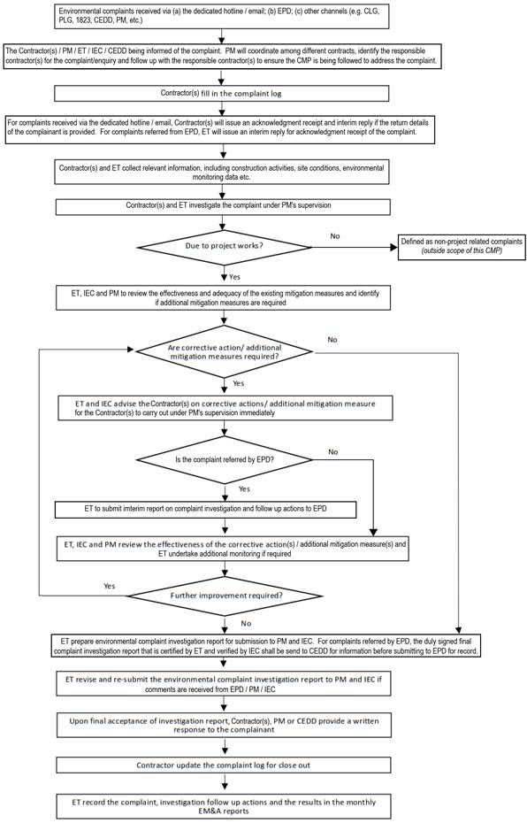 Upon final acceptance of the environmental complaint investigation report, Contractor(s), PM or CEDD would provide a written response to the complainant. Also, Contractor(s) would update the record with details of the complaint investigation, follow up actions and other relevant information of the complaint in the complaint log-book. The time that would take to investigate a complaint depends on the circumstances involved and would be different for each individual case, still, a reply would be provided within 14 days from the receipt of the complaint and be provided with an update of the investigation, and would also be given the investigation results when available. For cases where the complaint is referred from EPD, the ET shall provide the final complaint investigation report (certified by the ET and verified by the IEC) to EPD for their reply to the complainant.