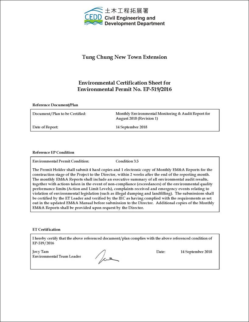 This EM&A Report presents the findings of the EM&A activities undertaken during the period from 1 to 31 August 2018 in accordance with the Updated EM&A Manual and the requirements of the Environmental Permit (EP-519/2016).