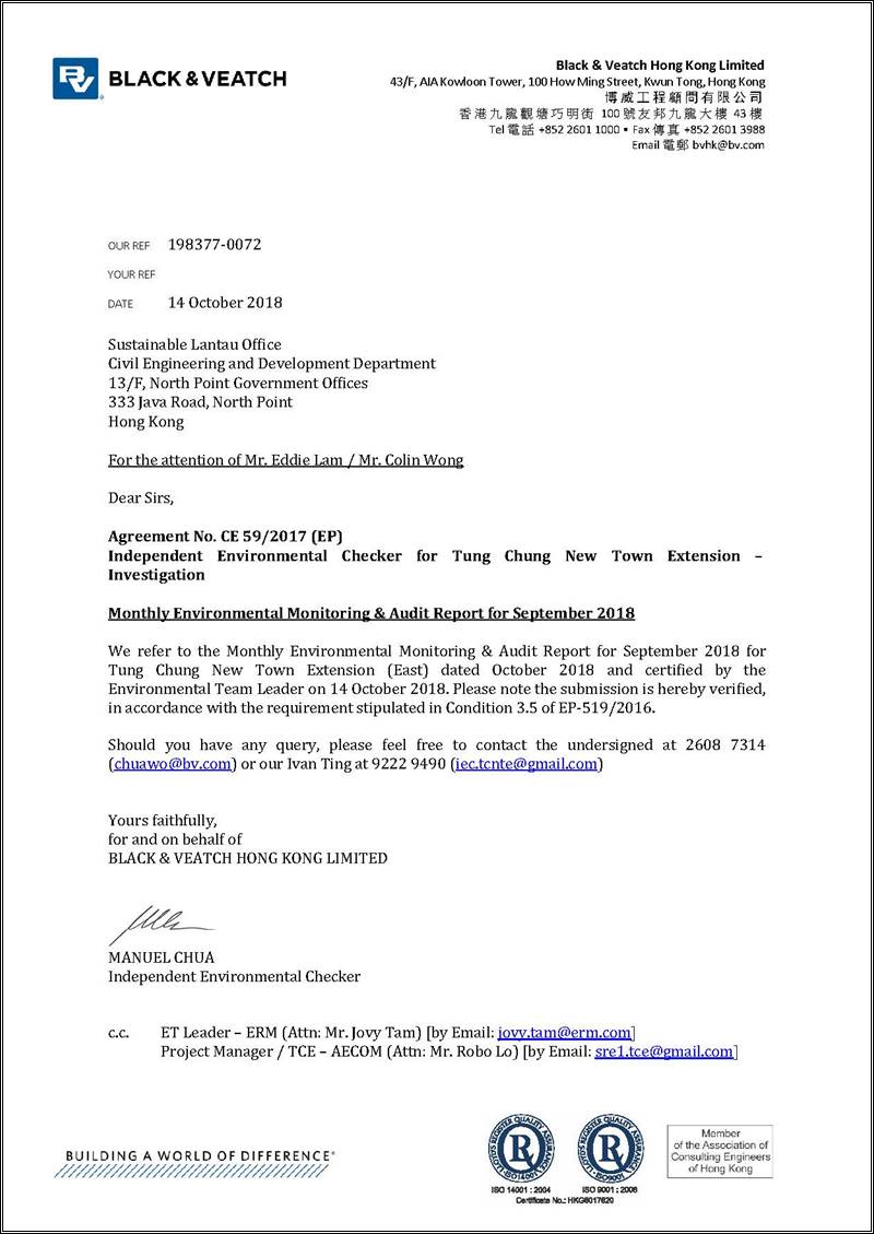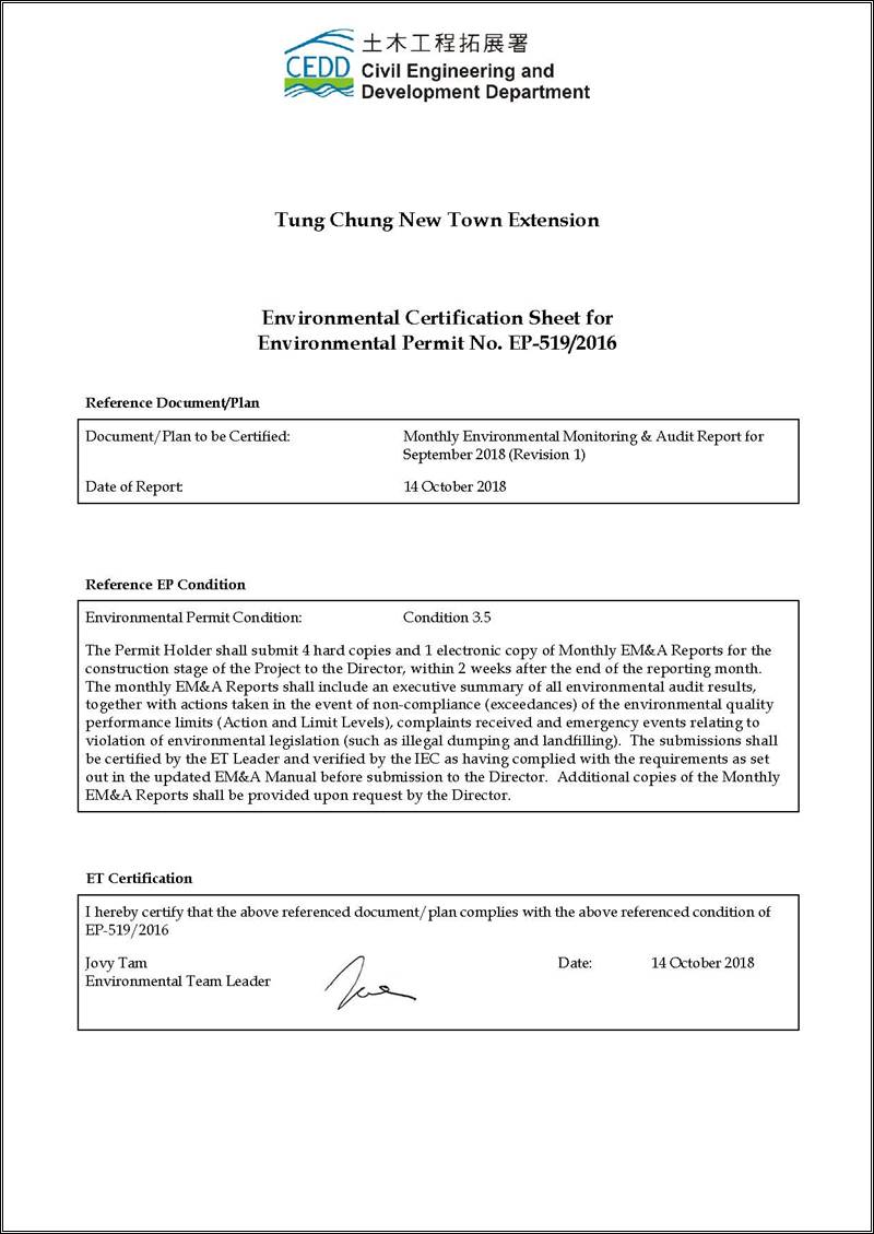 This EM&A Report presents the findings of the EM&A activities undertaken during the period from 1 to 30 September 2018 in accordance with the Updated EM&A Manual and the requirements of the Environmental Permit (EP-519/2016).