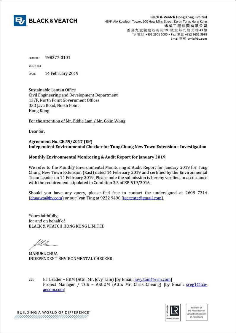 This EM&A Report presents the findings of the EM&A activities undertaken during the period from 1 to 31 January 2019 in accordance with the Updated EM&A Manual and the requirements of the Environmental Permit (EP-519/2016).