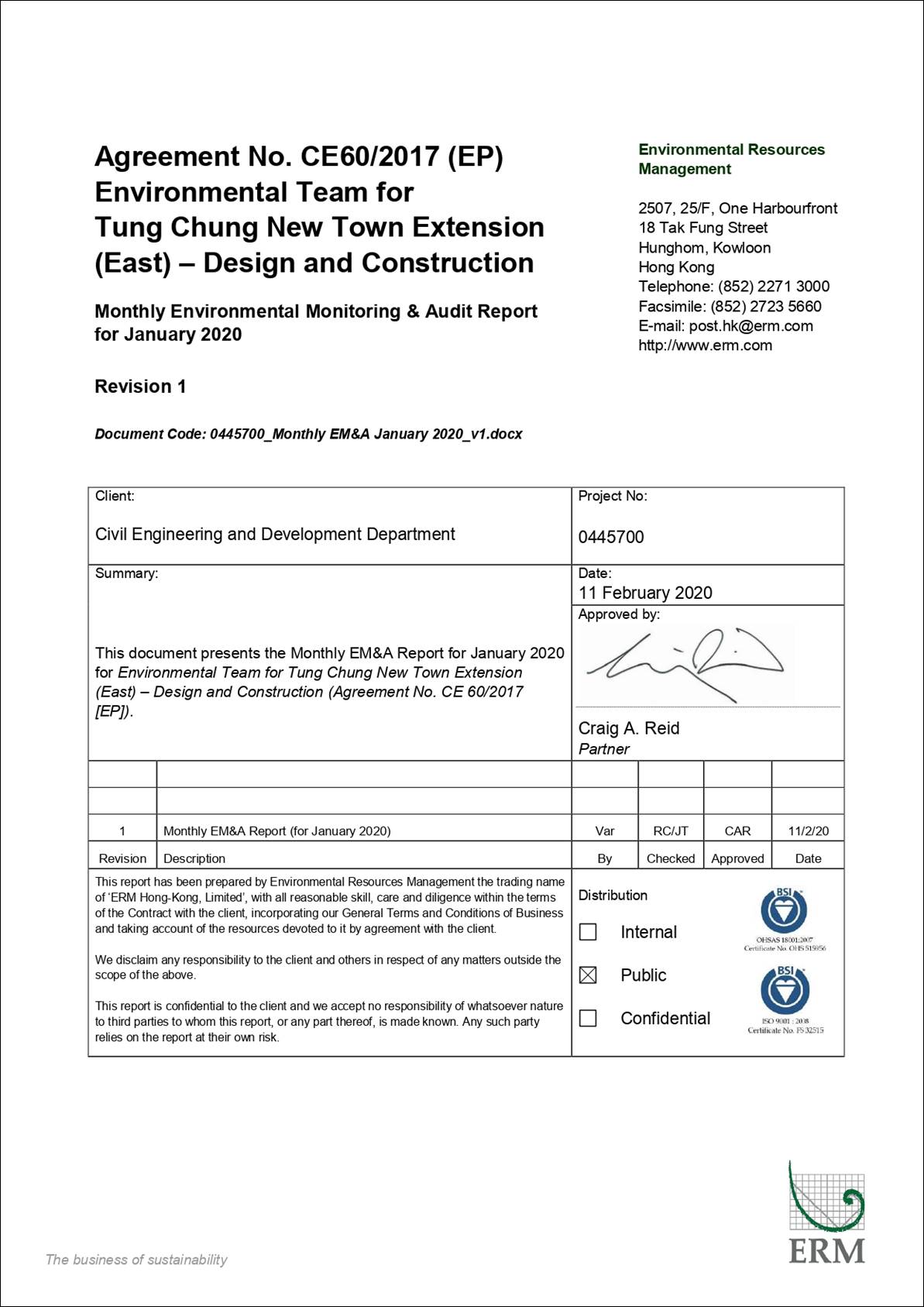 This EM&A Report presents the findings of the EM&A activities undertaken during the period from 1 to 31 January 2020 in accordance with the Updated EM&A Manual and the requirements of the Environmental Permit (EP-519/2016).