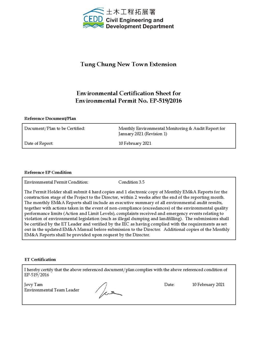 This EM&A Report presents the findings of the EM&A activities undertaken during the period from 1 to 31 January 2021 in accordance with the Updated EM&A Manual and the requirements of the Environmental Permit (EP-519/2016).