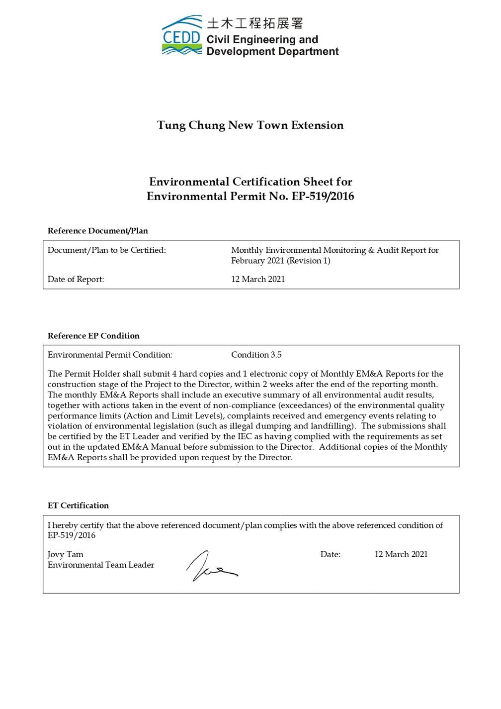 This EM&A Report presents the findings of the EM&A activities undertaken during the period from 1 to 28 February 2021 in accordance with the Updated EM&A Manual and the requirements of the Environmental Permit (EP-519/2016).