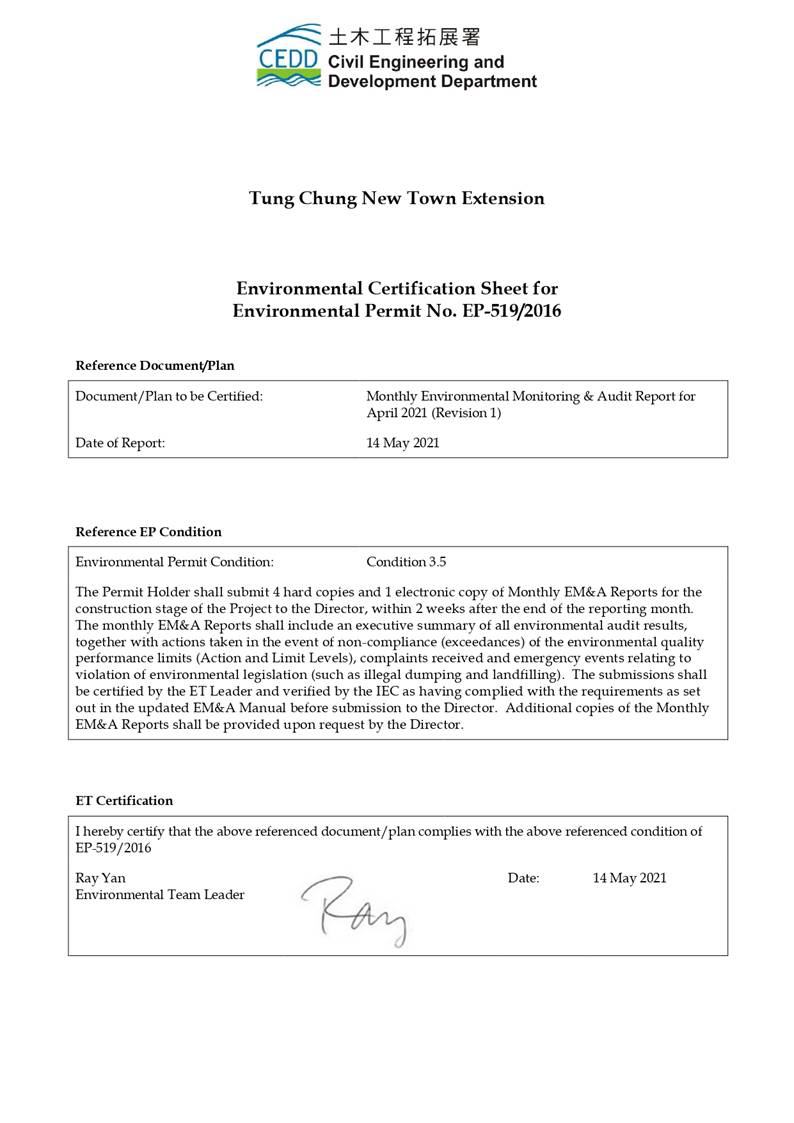 Potential environmental impacts arising from the upcoming construction activities in the next reporting period of May 2021 are mainly associated with dust emission, noise from barge and plant operation during normal working hours and restricted hours, elevation in SS due to sediment loss from laying of sand blanket and marine filling works, disturbance to Chinese White Dolphin (CWD) during marine works, handling and storage of C&D materials generated from construction activities, efficiency of wastewater and drainage management.  The ET will keep track on the construction works to confirm compliance of environmental requirements and the proper implementation of all necessary mitigation measures.  The ET will also recommend to the Contractor about the environmental toolbox topics on the abovementioned key issues for the coming month.
