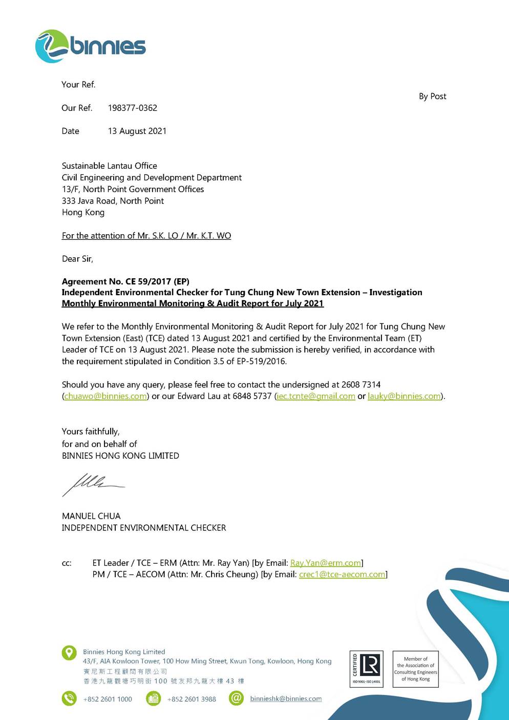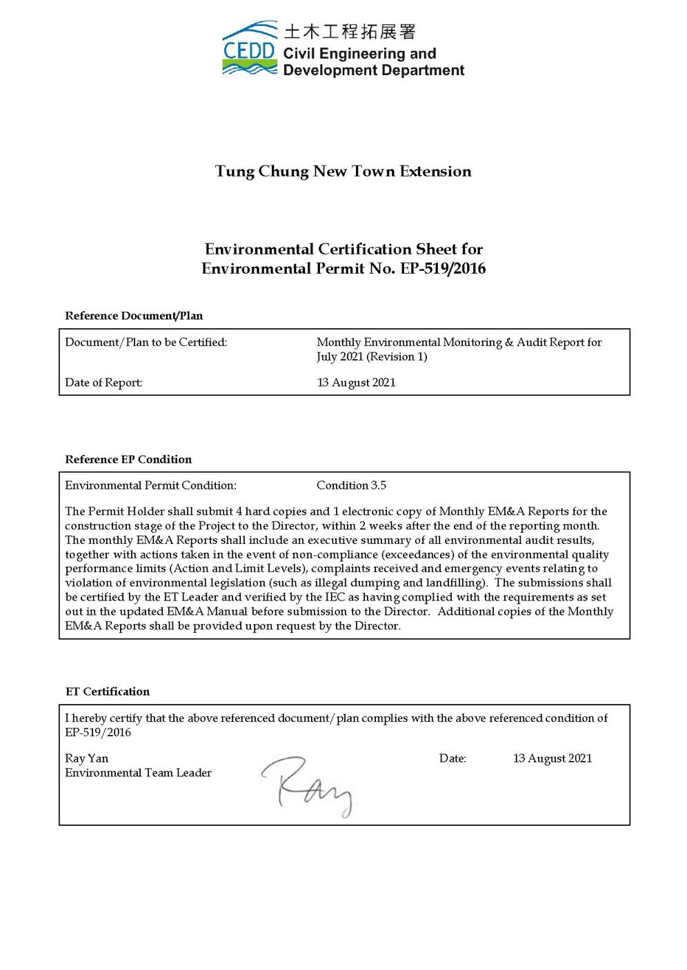 This EM&A Report presents the findings of the EM&A activities undertaken during the period from 1 to 31 July 2021 in accordance with the Updated EM&A Manual and the requirements of the Environmental Permit (EP-519/2016).