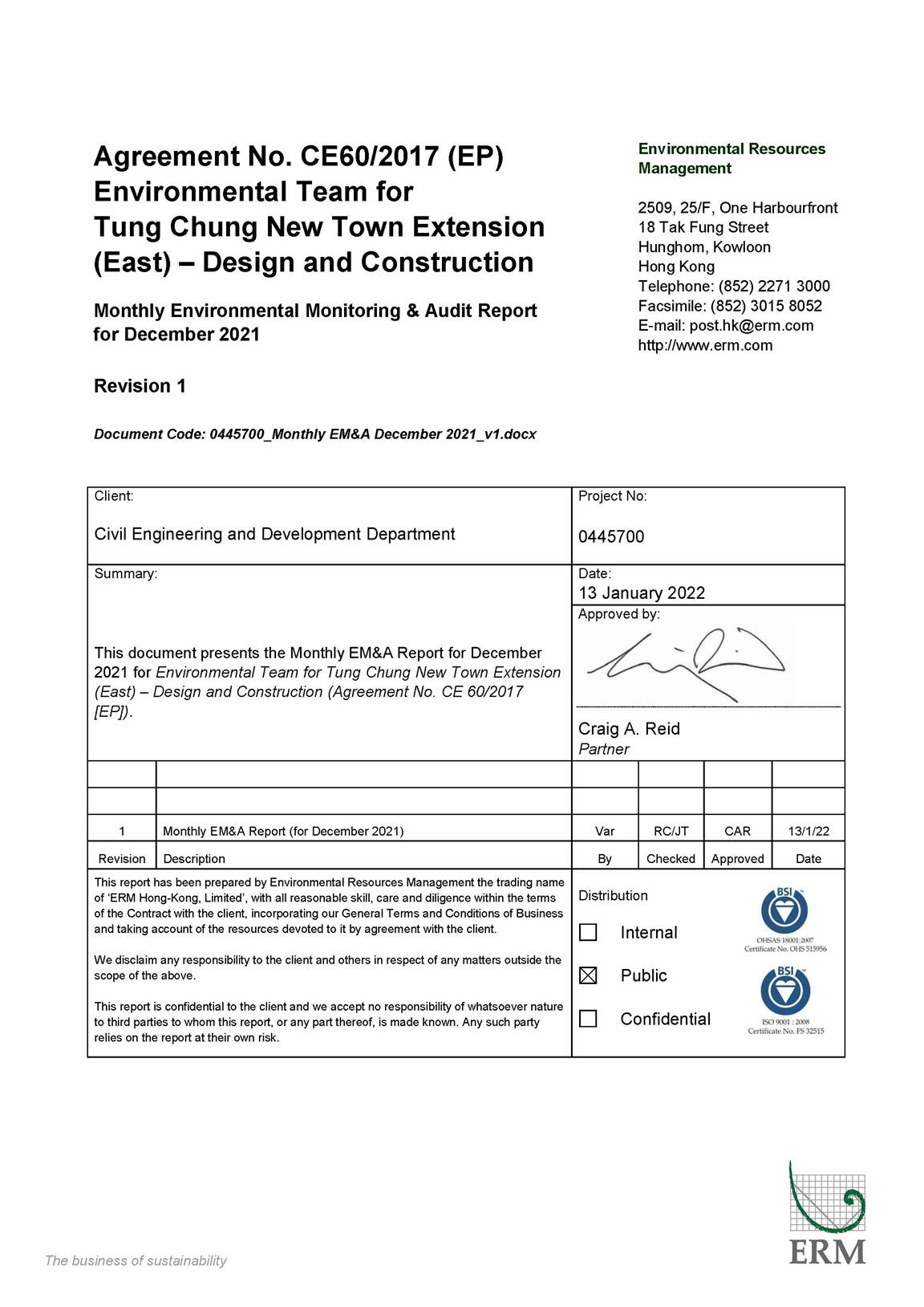 This EM&A Report presents the findings of the EM&A activities undertaken for the TCE Project during the period from 1 to 31 December 2021 in accordance with the Updated EM&A Manual and the requirements of the Environmental Permit (EP-519/2016).