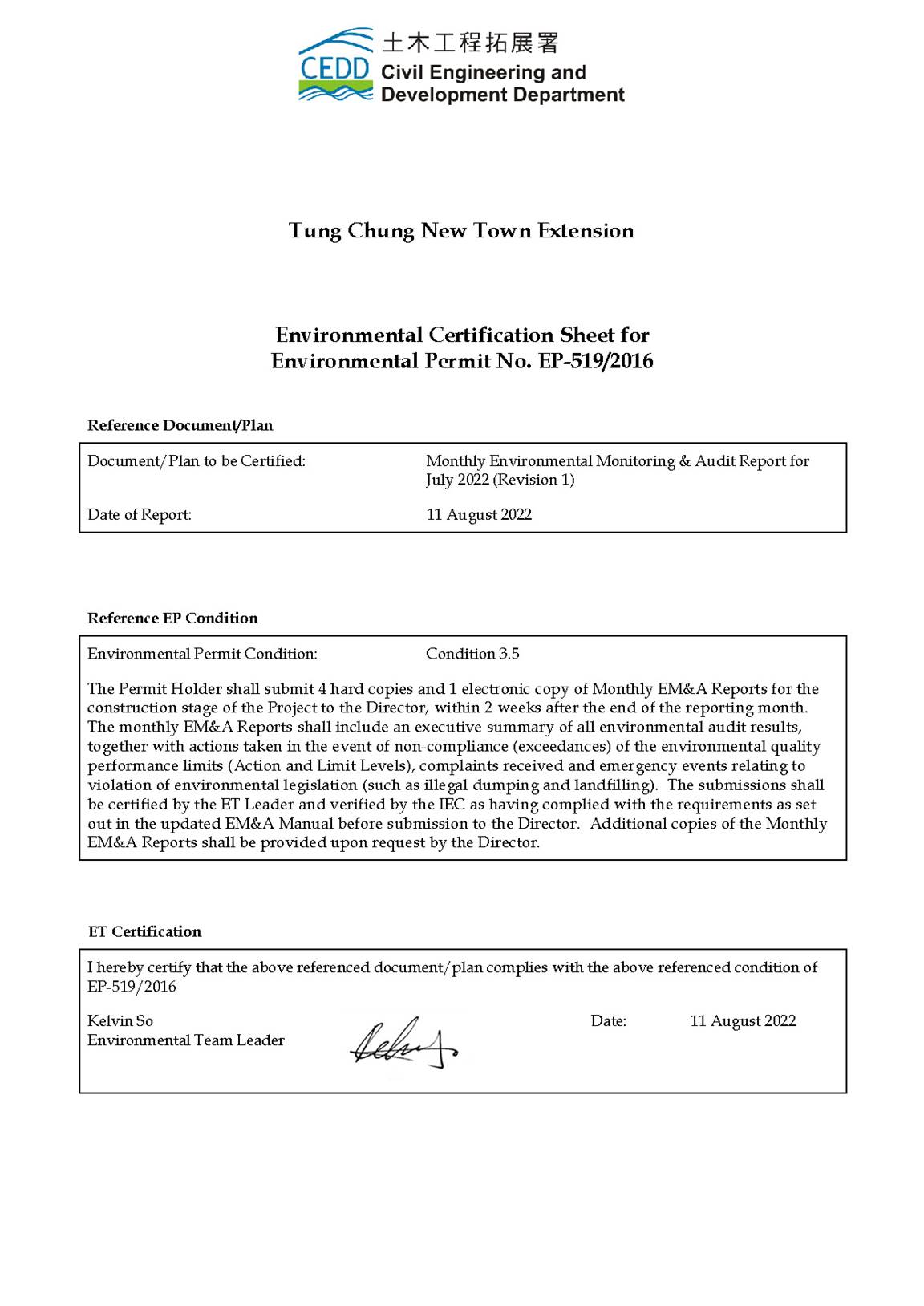 This EM&A Report presents the findings of the EM&A activities undertaken for the TCE Project during the period from 1 to 31 July 2022 in accordance with the Updated EM&A Manual and the requirements of the Environmental Permit (EP-519/2016).