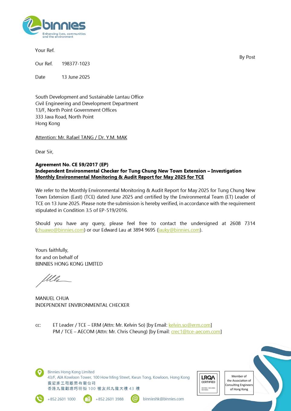 This EM&A Report presents the findings of the EM&A activities undertaken for the TCE Project during the period from 1 to 31 May 2025 in accordance with the Updated EM&A Manual and the requirements of the Environmental Permit (EP-519/2016).  The environmental monitoring, site inspection, environmental complaint handling and EM&A reporting in the temporary works area in Area 113 used by MTRC will be covered by EM&A programme of TUE and carried out by existing ET and IEC of TUE.